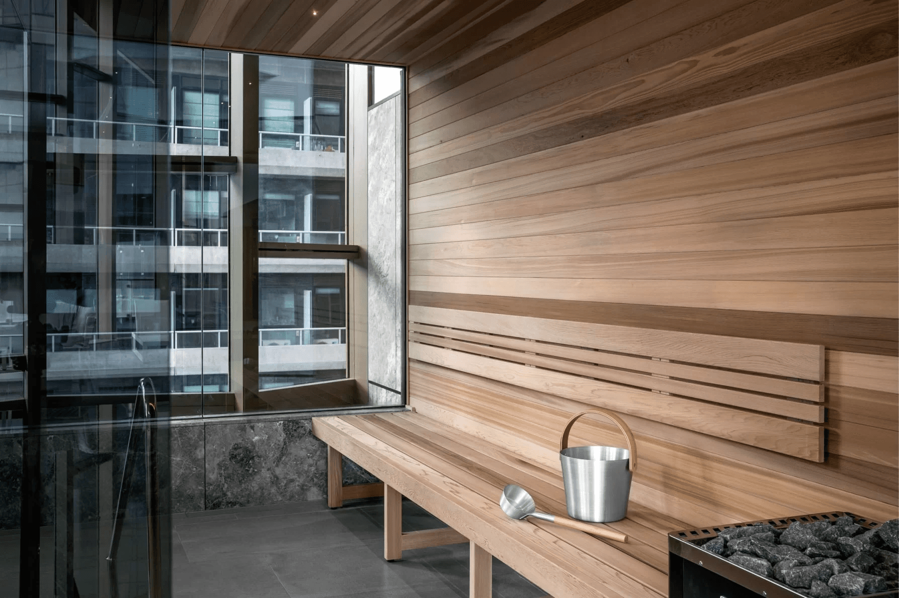 Bể bơi riêng biệt từng tòa, với phòng tắm hơi và phòng xông hơi